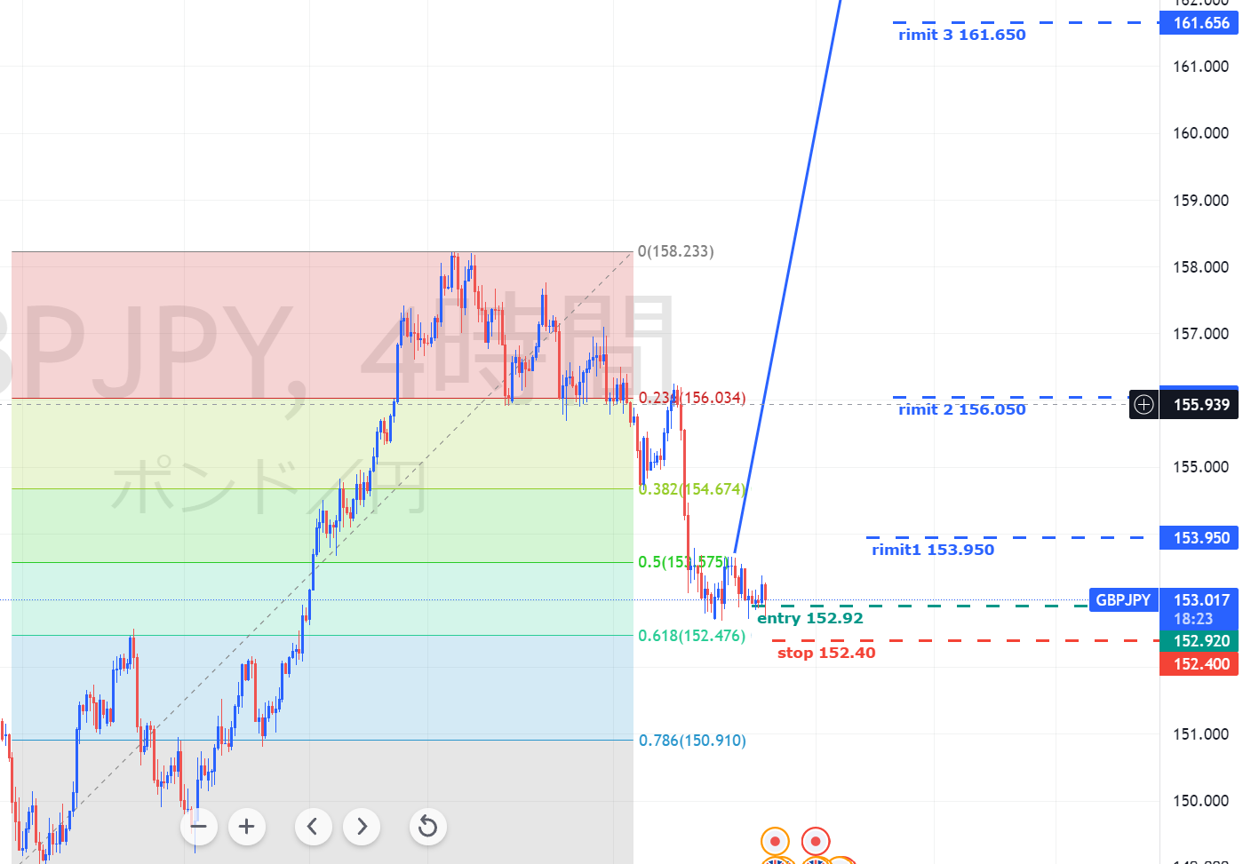 最後のY波動がきれいなジグザグになり、その終点の推定値と、直前の上昇推進波のフィボナッチリトレースメントの38.2または50.0が一致するようなシチュエーションが発生したら、ロングを狙いにいきたいと思いますが、まだまだ先の話ですね。