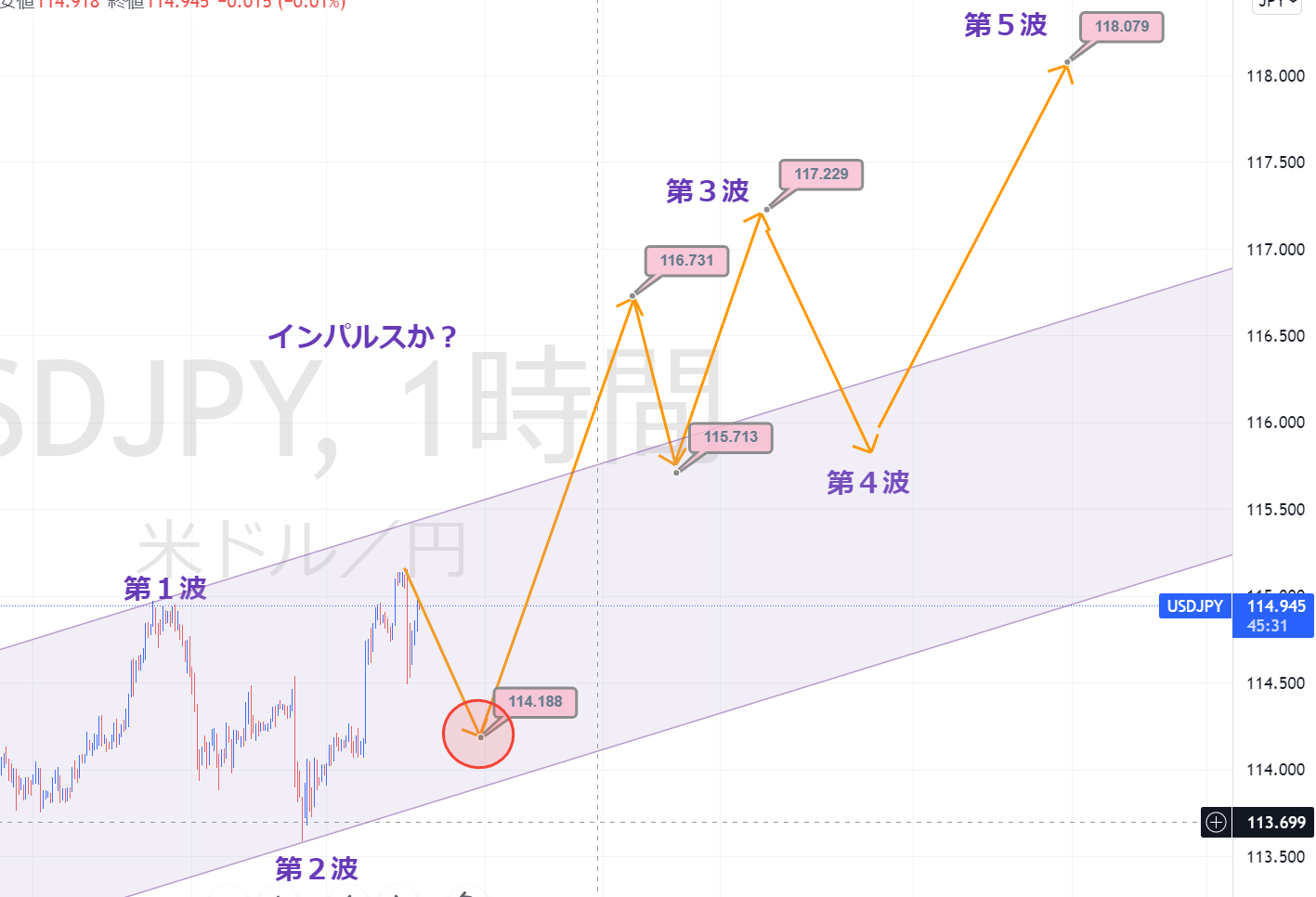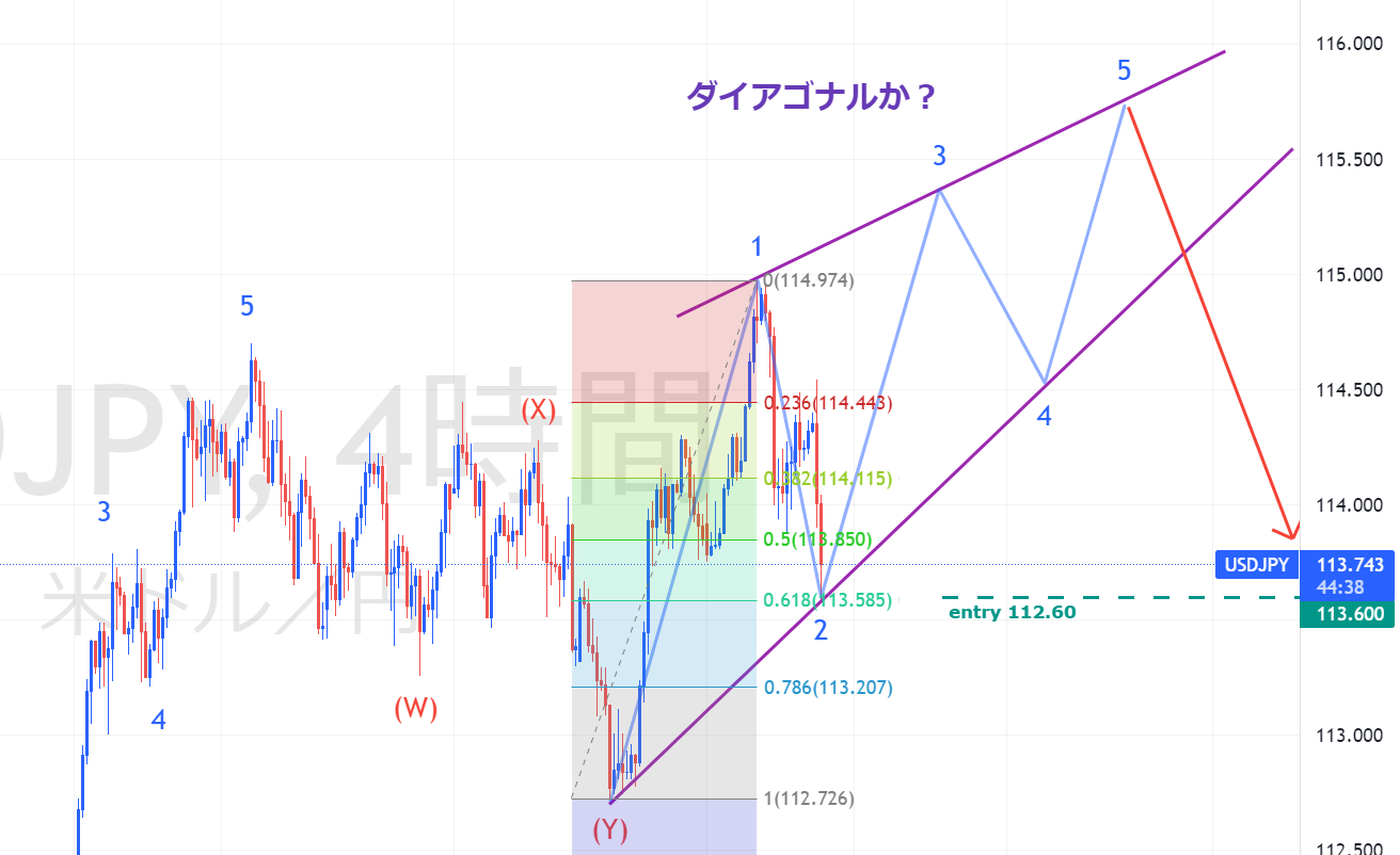 直近の114.699までの上昇が、第3波なのか?第5波なのか?については、検討の余地があるところですが、そこからの調整波動の期間がかなり長くなっているところから、これについては、5波が完成したものと仮定しています。